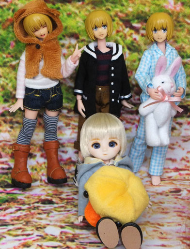 後列、左と真ん中の子の写真をツイッターで見て憧れて、それを真似して自分で作ったのが右側の子。プライズフィギュアのヘッドを使ったカスタムドールです。