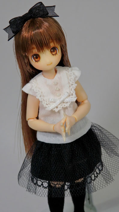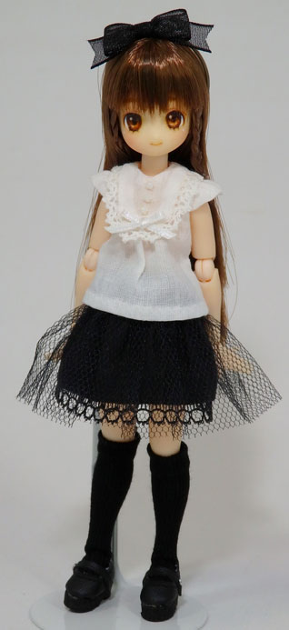 「小さなお人形のためのドール・コーディネート・レシピ」掲載のヨークブラウス、チュールスカート、タップパンツ、ソックスのセットです。