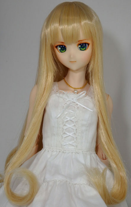 小さなドール用ウィッグのお店の「カスタム用ストレート」をカスタムしたもの。前髪部分をカットして、後ろ髪の毛先を人間用のカーラーで巻いてお湯パーマしています。