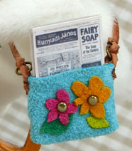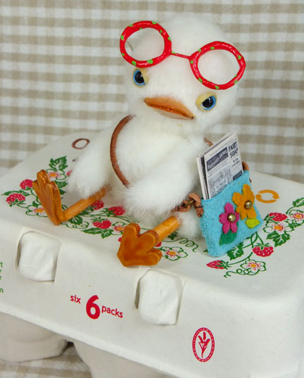 メガネと新聞、肩掛け鞄にぴいちゃん本体を入れられる卵パックが付いていました。