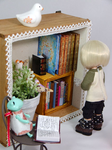 豆本コレクションもずいぶん増えて、本棚として利用している木枠には収まりきらない量になりました。