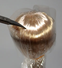 ヘッドにウィッグを被せて、水をたっぷり使って櫛で丁寧に梳かします。