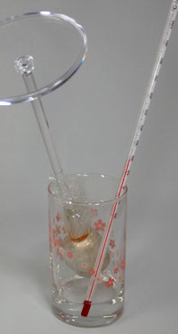 耐熱容器(写真はガラスのコップ)に熱湯を注いで、温度計で75度以上80度以下になったらヘッドを沈めます。ゴムで縛った部分が確実にお湯に浸かるように注意します。