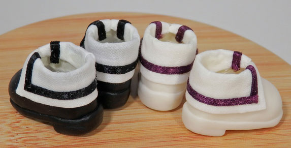 最初は合皮で作ろうとしていましたが、原作のデザインに則した「おでこ靴」にしたくて樹脂粘土に変更。