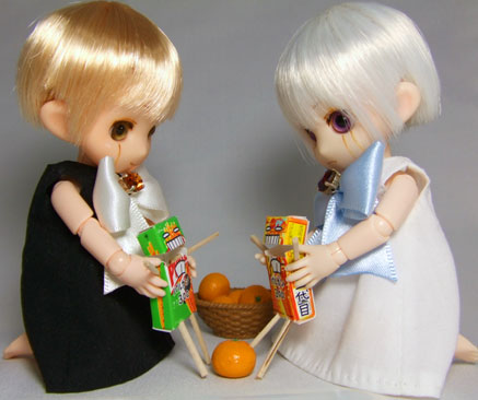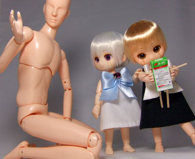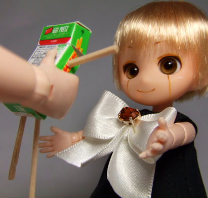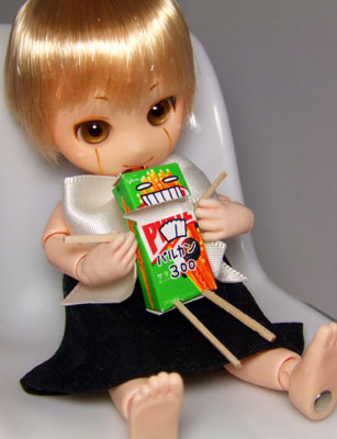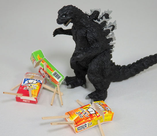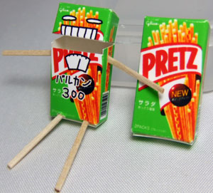お菓子の箱を丁寧に解体、スキャンしてCGソフトで1/6サイズに縮小→顔と文字を書いてプリントして組み立て。手足は爪楊枝を削って割り箸っぽくしました。
