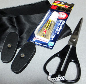 前回作った草履の土台に、サテン生地を貼りつけます。道具は布用ハサミと多用途接着剤を使いました。