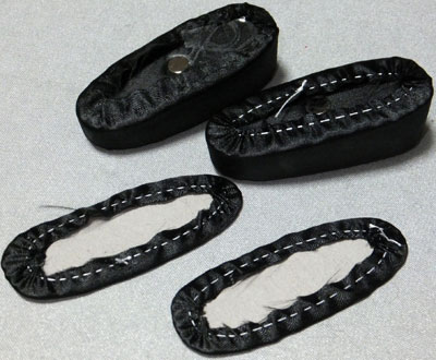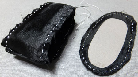 接着剤が乾いたら、貼りつけた布の余剰部分を針と糸を使ってぐし縫いして、糸を引き絞って形を整えます。