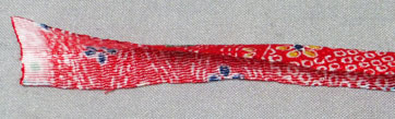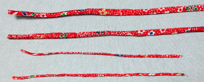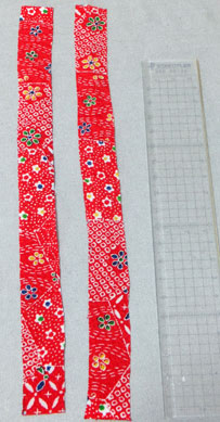 可愛いちりめん生地を持っていたので、この布で2種類の太さの紐を作ります。