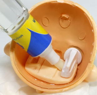 この液を、説明書通りの使い方で頭のフタの繋ぎ目に沁み込ませます。少し塗ったくらいでは足りないので、接着面がグズグズ動き出すまでしつこく塗り込みました。