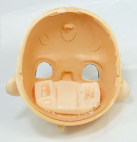 アイ固定用のパーツはPVC樹脂で出来ていて、首ジョイント軸の受け穴にもなっています。薄いABS製のヘッドの補強パーツになっている(と思う)ので、これは無理に剥がさない方が良いと思います。