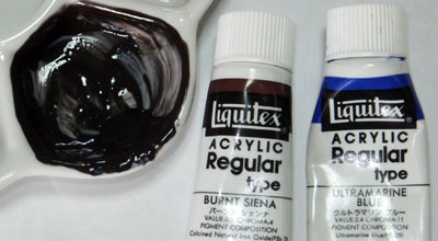 続いて、バーントシェンナとウルトラマリンブルーを1:1で混ぜ合わせて黒っぽい色を作ります。