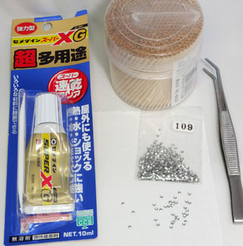 ピンセットでパーツをつまんで、爪楊枝で裏側に接着剤をちょこっと塗って貼り付けました。