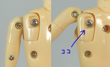 壊してしまったのは青色の矢印で指しているネジ留めの関節で、肩を上げ下ろしできる関節軸、人間で言うと肩甲骨にあたる部分です。