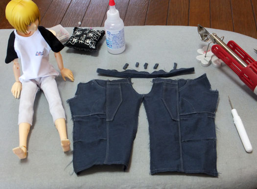 解体したパンツは立体裁断の要領で人形の脚のサイズに合わせ、余分な布は内股側で裁ちます。裁断した後は元の通りに縫い直して完成。