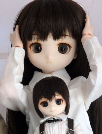 前髪をヘアピンで留めて、自分が化粧する時に使う鏡に向かってドールを抱きかかえ、鏡に映った人形の顔を見ながら。